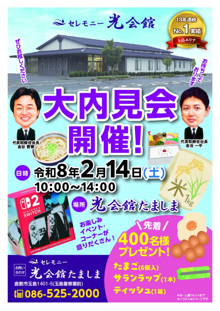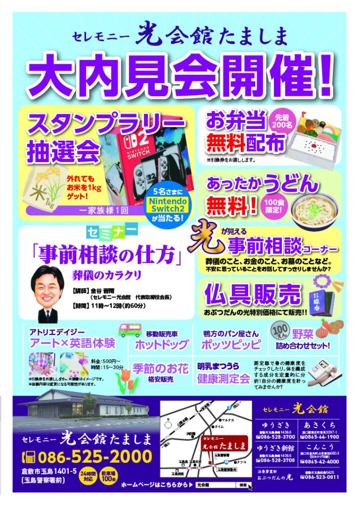 お問い合わせ:086-525ー2000(光会館たましま)